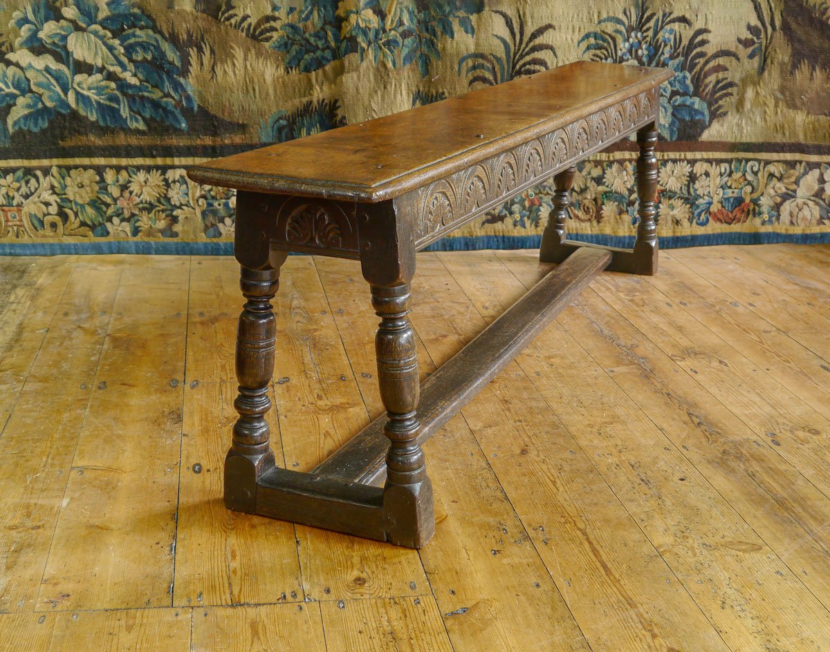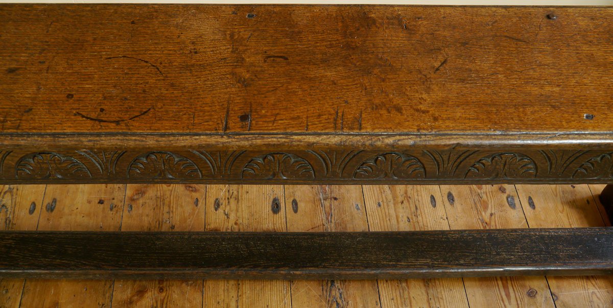 Originally made to accompany a long dining table, this bench has a single boarded top which is secured to the carved seat rails by five pairs of oak pegs. The rails themselves have ten stylised ferns set within semi-circular arches to each of the long sides, whilst there is a single fern and arch carved to each end (it is quite unusual to find all four sides carved – many benches only have one of the long sides decorated).