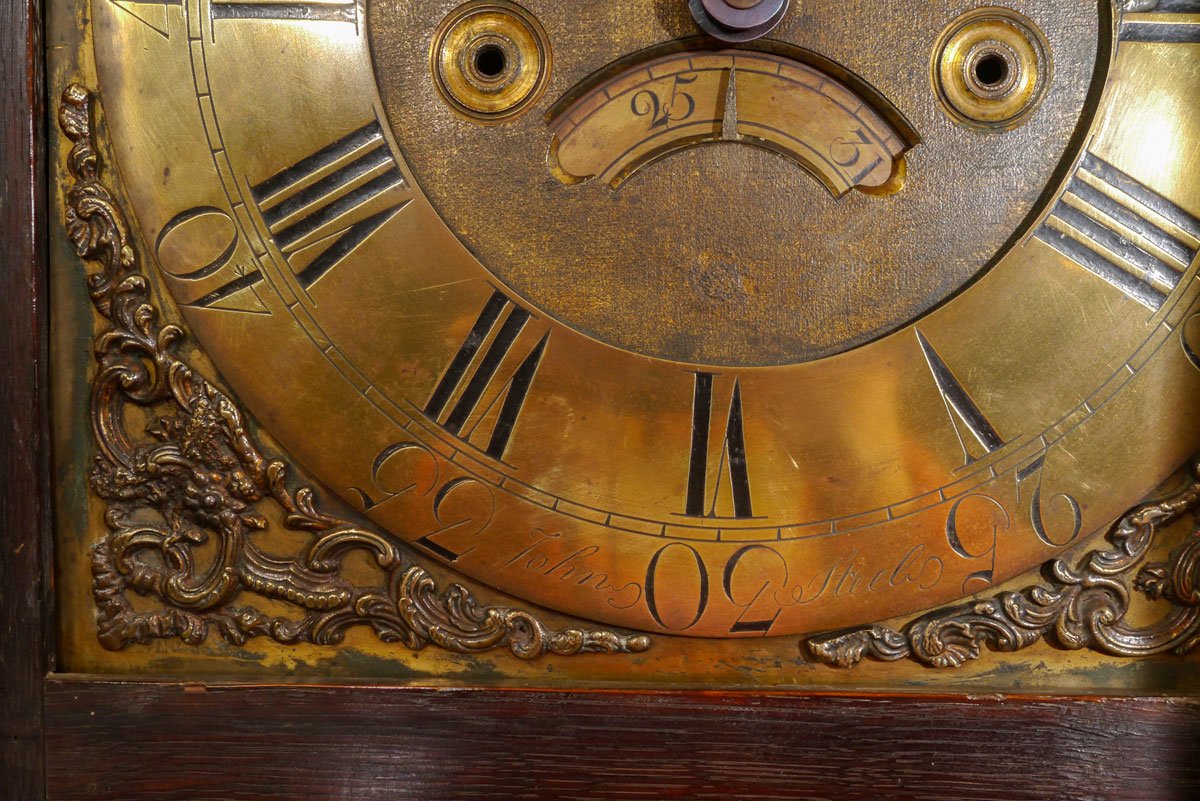 The 11 inch square brass dial, signed John Steel of Killamarsh,with plain matted centre and dummy ringed winding holes, showing the date on a lunette calendar and 30 hour movement. The dial and movement of the clock are interesting and very original, but it is the delightfully small case which makes this piece so rare.