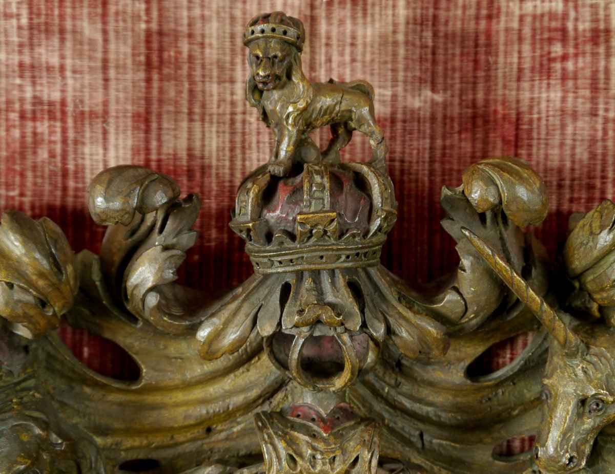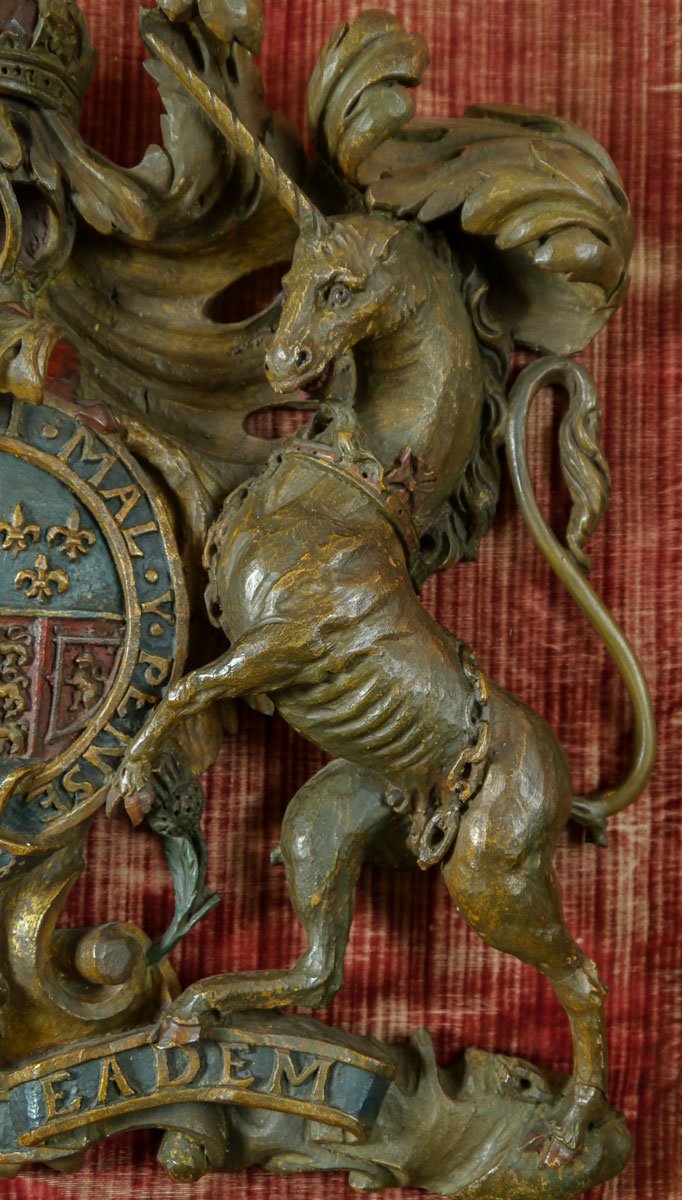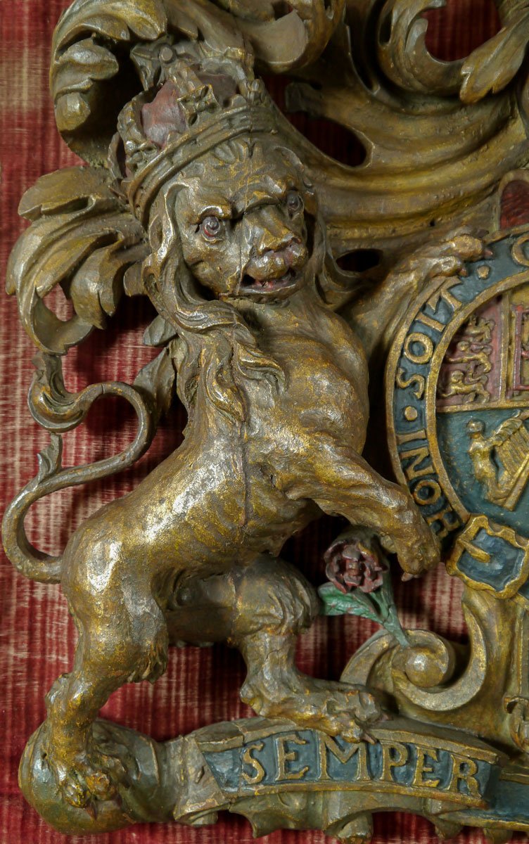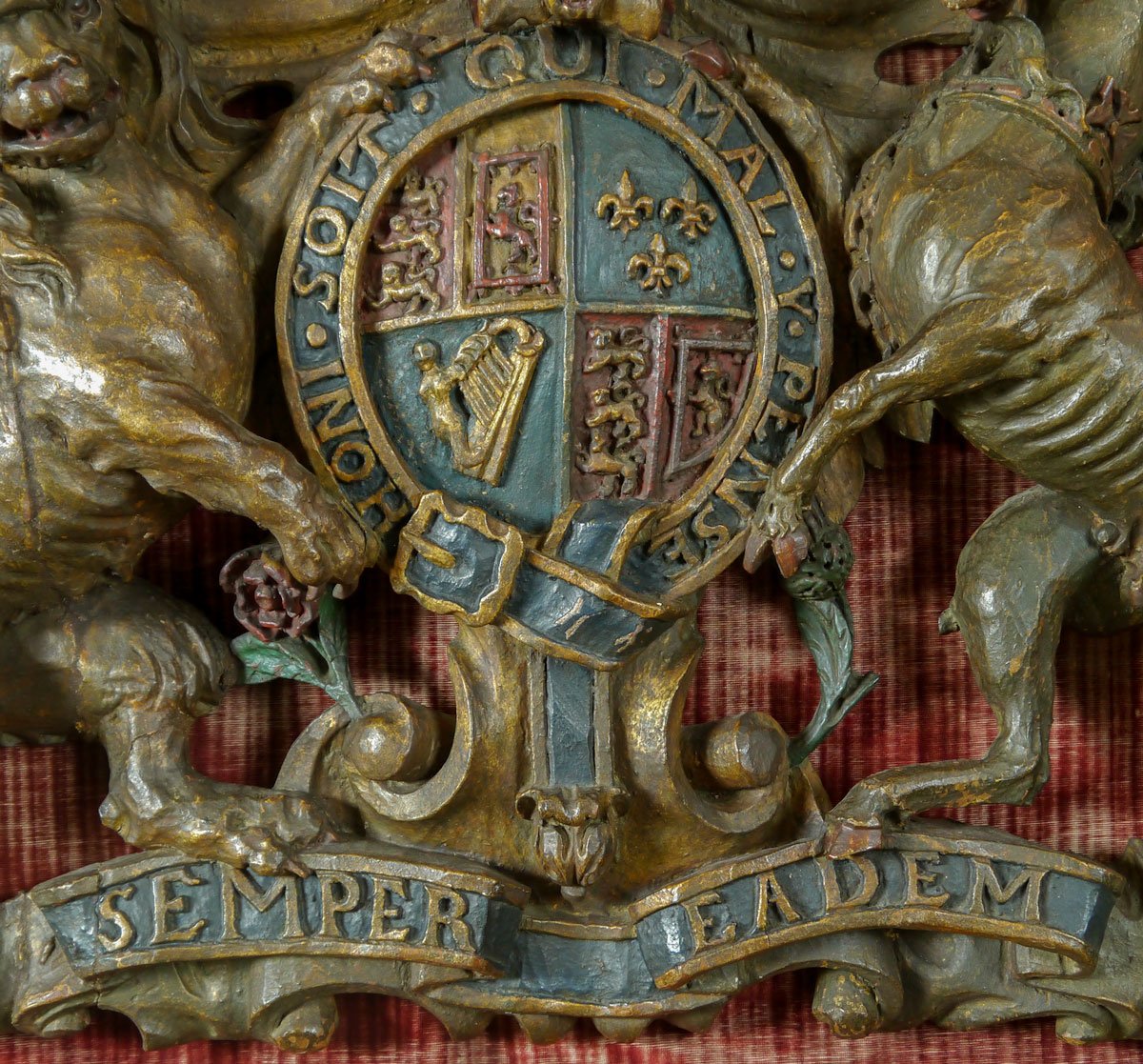 The crest, of a crowned lion, standing on a royal crown, flanked by scrolling leaves, and above the Royal Coat of Arms of England, surrounded by a buckled garter with the motto “Honi soit qui mal y pense” (Evil (or shame) be to him that evil thinks), supported by a crowned lion and a unicorn, beneath whose forelegs is the Tudor rose and Scottish thistle. The lion and unicorn stand on a banner, with Elizabeth I’s motto “Semper eadem” (Ever (or always) the same).