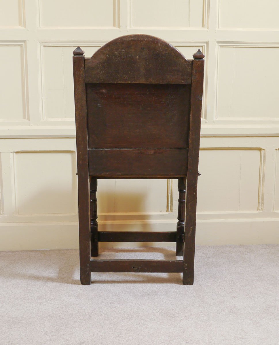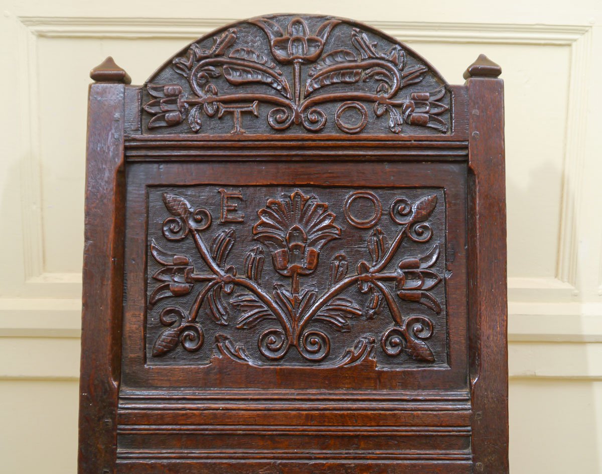 The central panel also contains a central flower and this time is flanked by the initials E and O. Further flowers, leaves and scrolls complete the carved decoration. The bottom rail of the back has multiple horizontal run-mouldings.