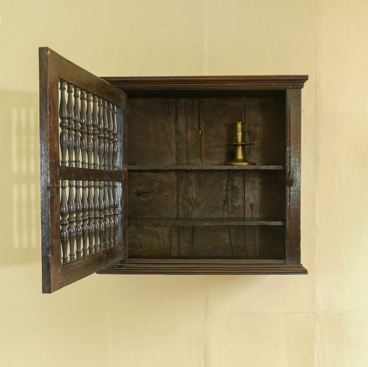 Having a moulded cornice above the single opening door, which opens on “pin” hinges and is divided horizontally into two panels, each filled with delicately turned spindles. The frame of the door is decorated with run-mouldings. When open there are two original shelves.