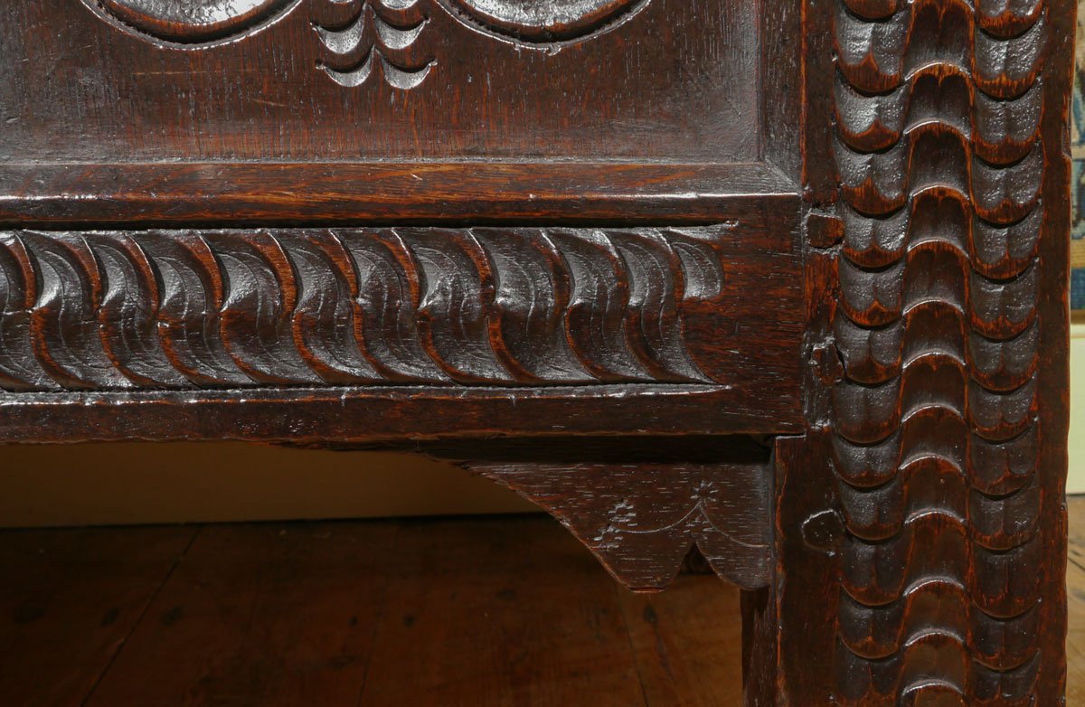 The deeply carved top rail of “S” scrolls, with central whorls, is set above three panels, the outer two carved with a quatrefoil design, flank the central panel, which has a stylised floral and leaf design. The two muntins also have a floral design, whilst the bottom rail and stiles are carved with an interlocking chain device, very typical of Wiltshire, around the Salisbury area. Between the bottom rail and stiles are two original punch decorated corner brackets.
