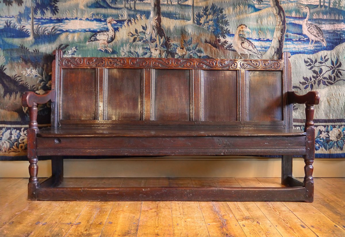 An Early Charles II Oak Panel Back Settle