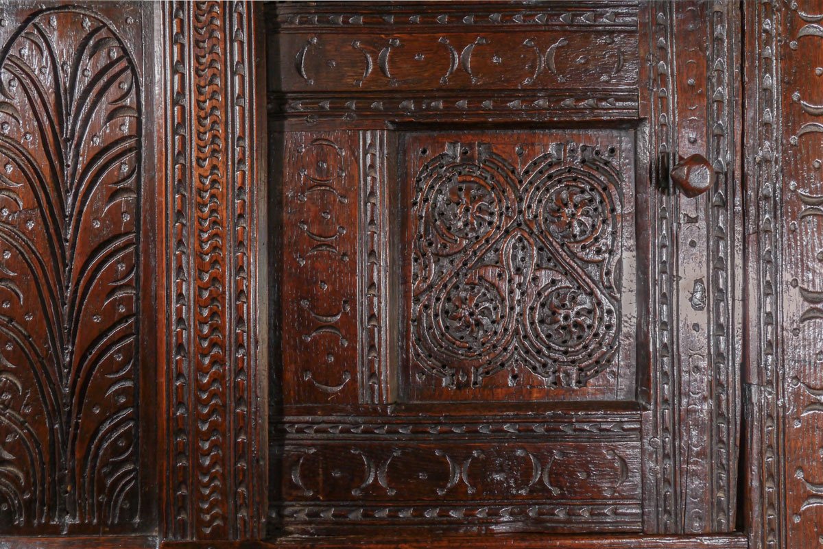 Having boarded back, top, bottom and sides, the front is framed, creating a single panel and larger single door. The single panel is carved with a stylised leaf design, whilst the door has a double “S” scroll with tight whorls to the centres. The symmetrically carved top rail is carved with a series of interlaced lunettes, which again have a stylised leaf in each centre. To either end of the rail is the date 1647, which is totally correct for the style of carving and construction of the cupboard.