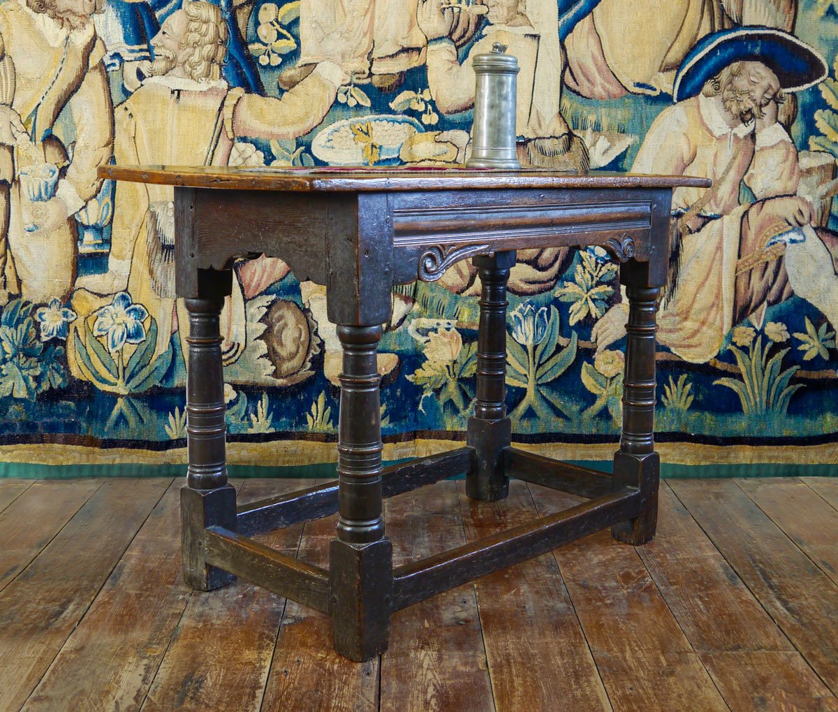 The boldly-turned columnar legs are quite exceptional, and decorated with ring turnings throughout the length. The block feet are joined by chunky square stretchers.