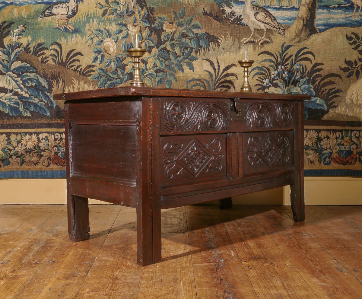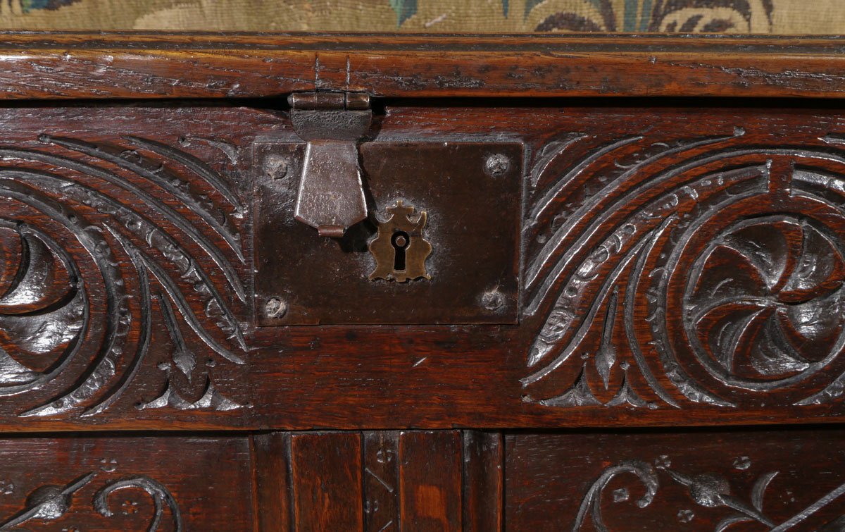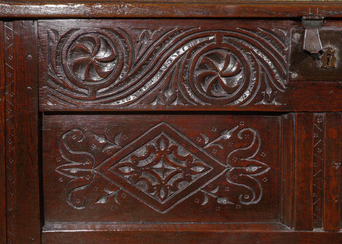 The three-panel lid, retaining the original pin hinges, above an exceptionally deep top rail, which is boldly carved with a trailing “S” motif, and symmetrical whorls, and retains the original iron lockplate. The two panels have a lozenge carved centre, with stylised tulip heads coming from the pointed ends. The stiles, muntin and bottom rail are all decorated with a flat run-moulding, with punched decoration.