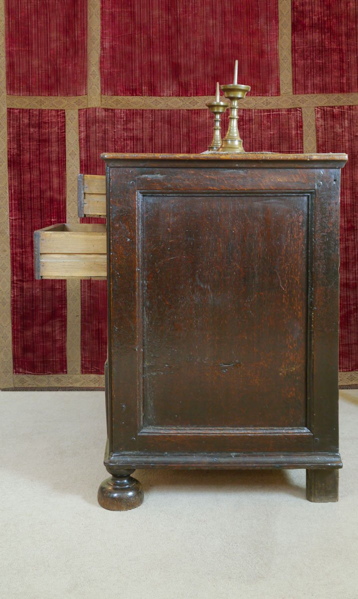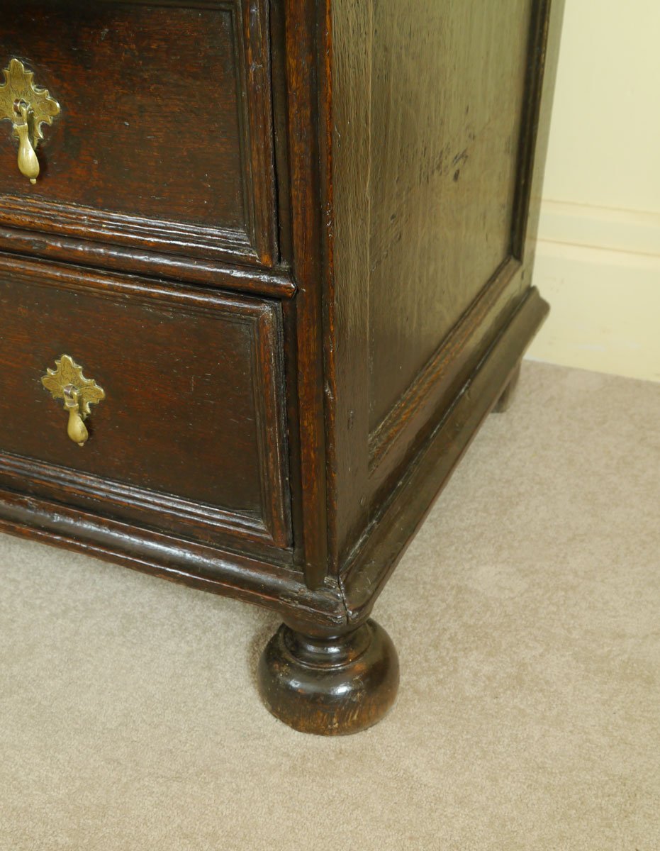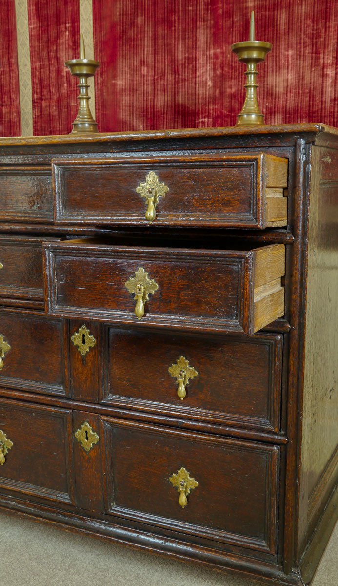 The two-plank top, with applied edge moulding, is fastened to the front and side rails, with short square oak pegs, sitting above a surprising drawer configuration. As one would expect, the top two drawers are half-drawers, but the next row down are also half-drawers, whilst the bottom two drawers are full length. The drawers are all decorated with mitred mouldings, whilst the frame is decorated with half-round or D-moulding. The chest sits on its original flat bun feet, below a concave bottom moulding.