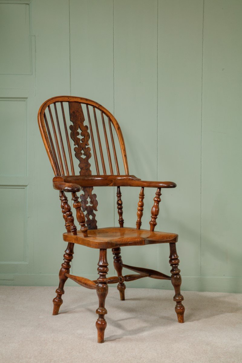 Known at the time of their manufacture as a "Smoking High Windsor Chair", but now more commonly called a "Broad Arm Windsor Chair", this example is made in very well figured yew, with a burr yew centre splat. The shaped saddle seat is made in burr elm, an unusual feature, but a sign of the quality of the maker. Broad Arm Chairs are never stamped by the maker, but instead have a paper label glued or nailed to the underside of the seat. From the style of arm and leg turnings it is highly likely that this chair was made in the workshop of Isaac Allsop of Worksop, who was making chairs between 1871 and 1887.