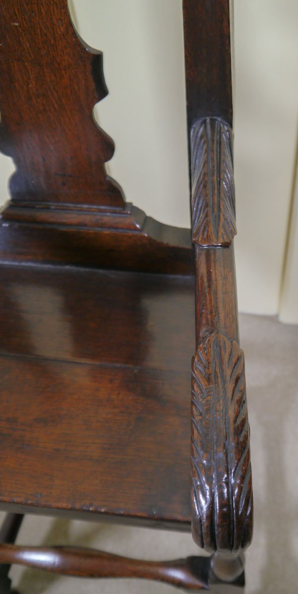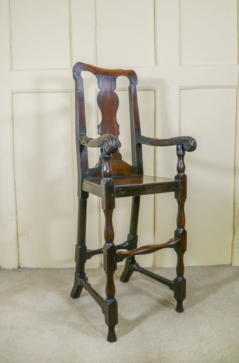 A beautifully proportioned child’s high chair, the shaped cupid’s bow top rail above a well-shaped chamfered back splat, above a boarded seat. The scrolled arms, with acanthus leaf carving, supported on elegantly turned baluster legs, which in turn are joined by similarly turned stretchers. The back legs have a tremendous rake at the bottom, to prevent the chair toppling backwards when in use.