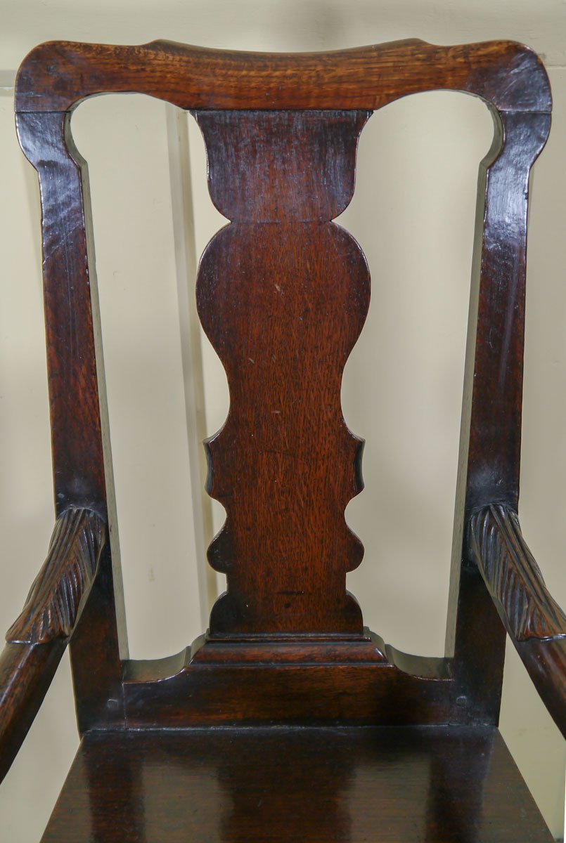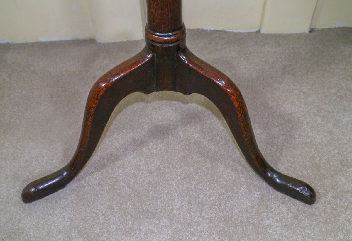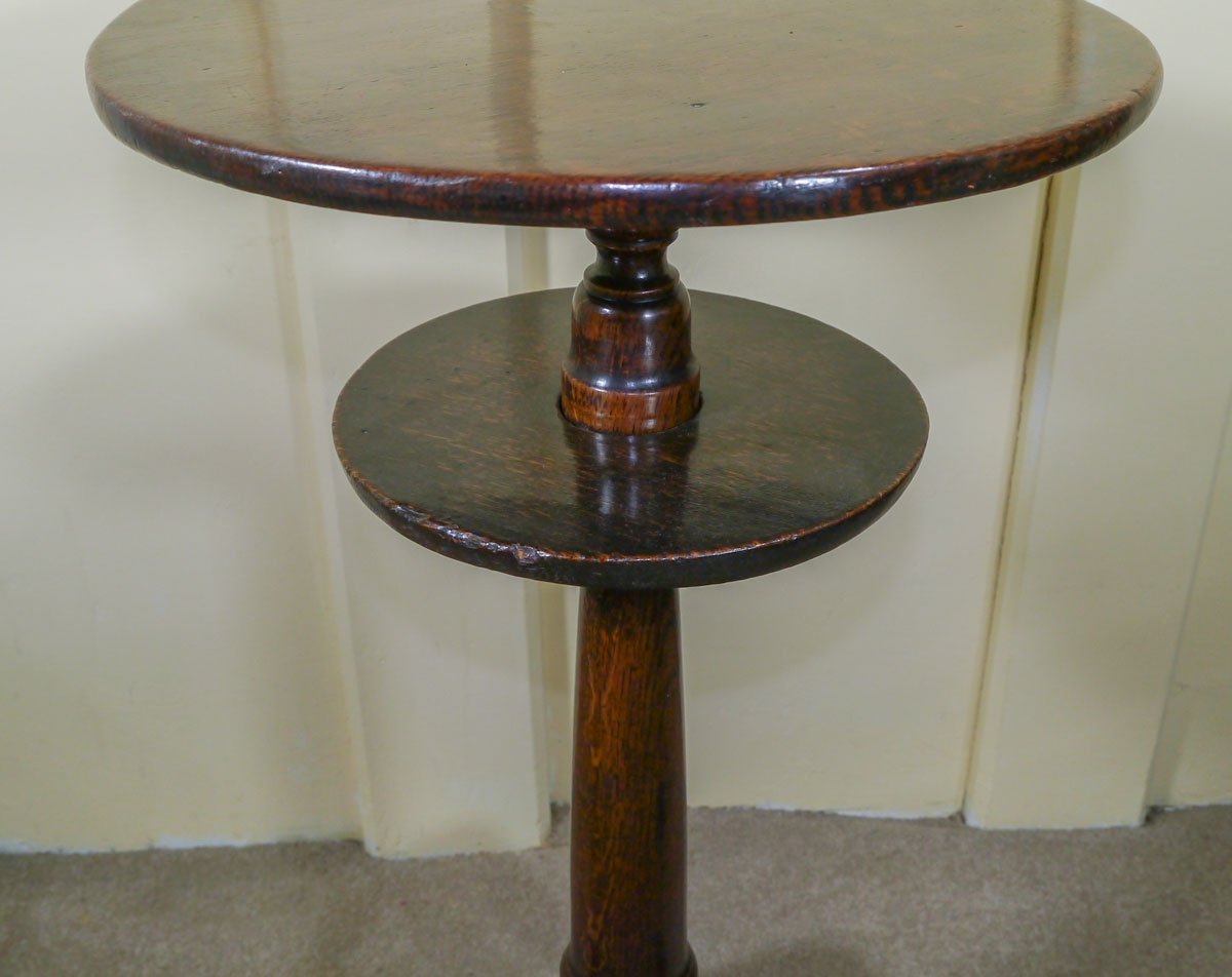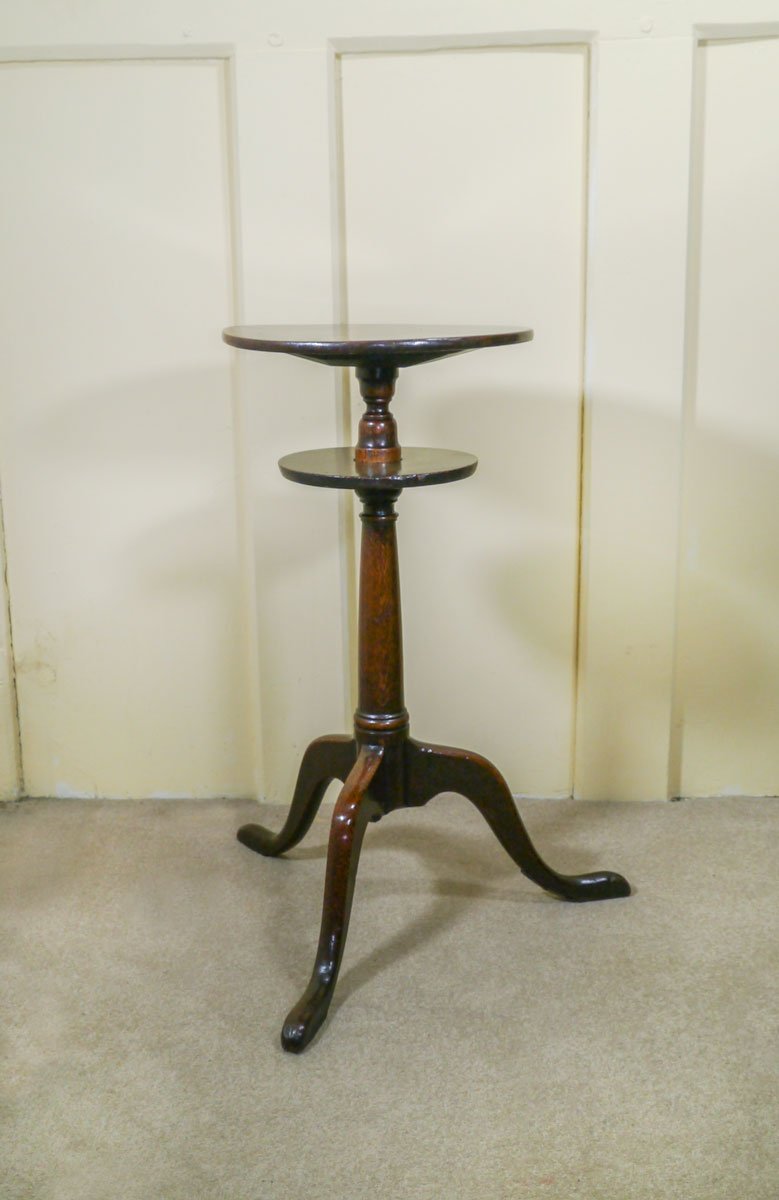 The candlestand dates from early in the George II period, and is of a most unusual form. The single piece top sits above a slightly smaller “undershelf”, which again is made from a single piece of oak, which is slotted over the turned stem prior to the top being fitted. The tapering stem then continues down to out-curving cabriole legs.